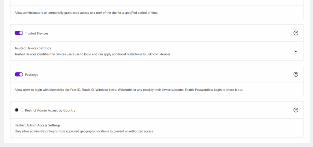 The Restrict Admin Access by Country feature provides a significant additional layer of security. While there is some functional overlap with Trusted Devices, they work best when used together: