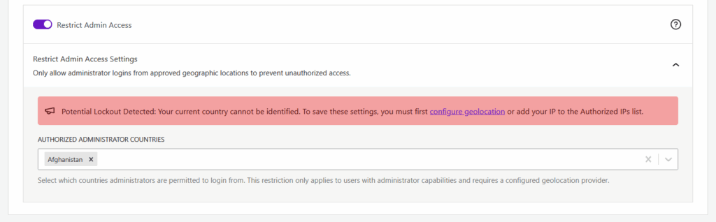 Similar to the country list, defensive logic protects you here as well. If you attempt to remove your current IP address from the Authorized IPs setting, and your geolocated country is not in the list of Authorized Administrator Countries, the plugin will alert you to prevent a potential lockout.