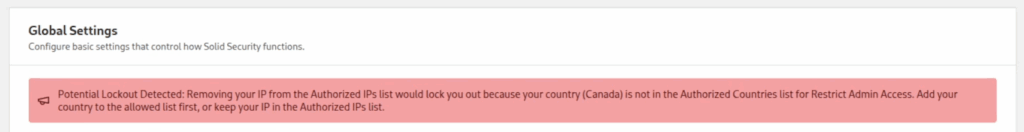 To prevent you from accidentally locking yourself out, defensive logic has been added to the settings page. Solid Security will notify you if you attempt to save a list of countries that does not contain your current country, based on the geolocation of your current IP address.