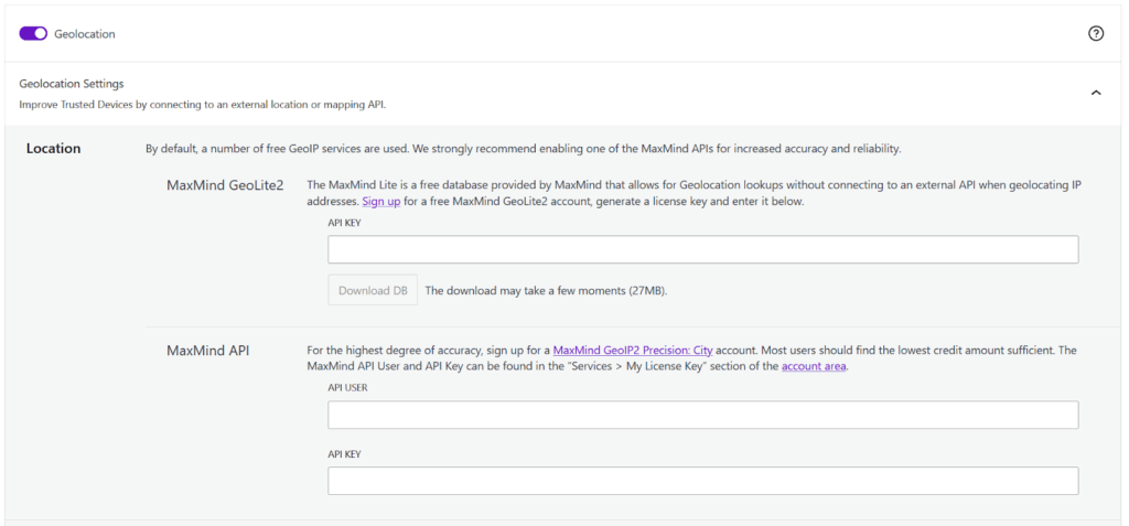 To improve the accuracy and reliability of the geolocation data used by this feature, we strongly recommend that customers sign up for and configure one of the MaxMind APIs. You can reference these in Settings > Features > Utilities.