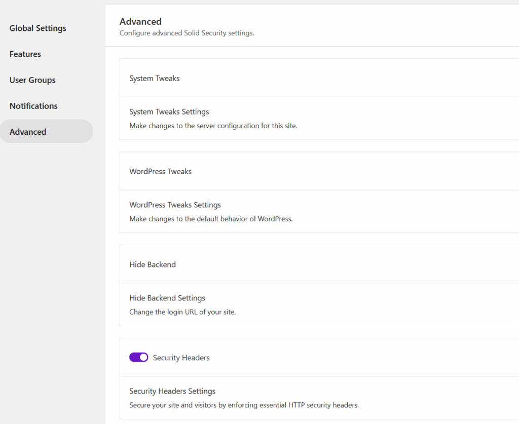 To access these settings, navigate to Settings > Advanced in your WordPress dashboard. Locate the Security Headers setting and toggle it on.