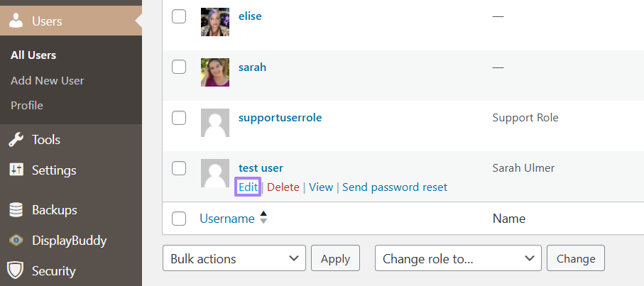 In the WordPress Dashboard, Select Users, and then Edit under the Username you wish to escalate.